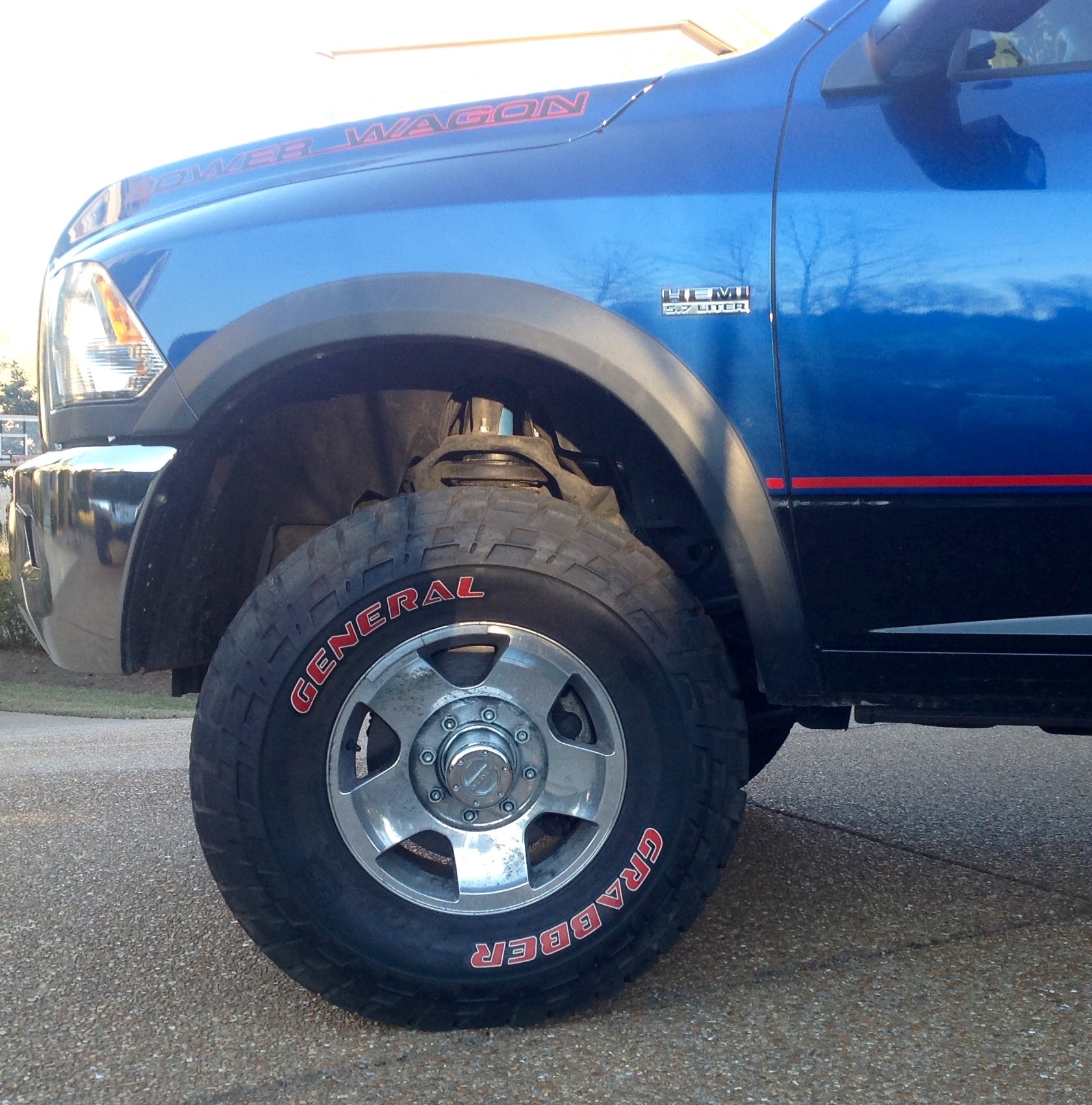 2010 Ram Power Wagon. dual exhaust, CAI, 87mm moes throttle body, diablo intune, spyntec manual hub kit, icon control arms, top gun customz panhard adjustable bar, 2 inch coil spacer. Stock shocks. 35x12.50x17 general grabber red letter out, amp power steps. Electric fan. Top gun customz +2 sway bar end links.