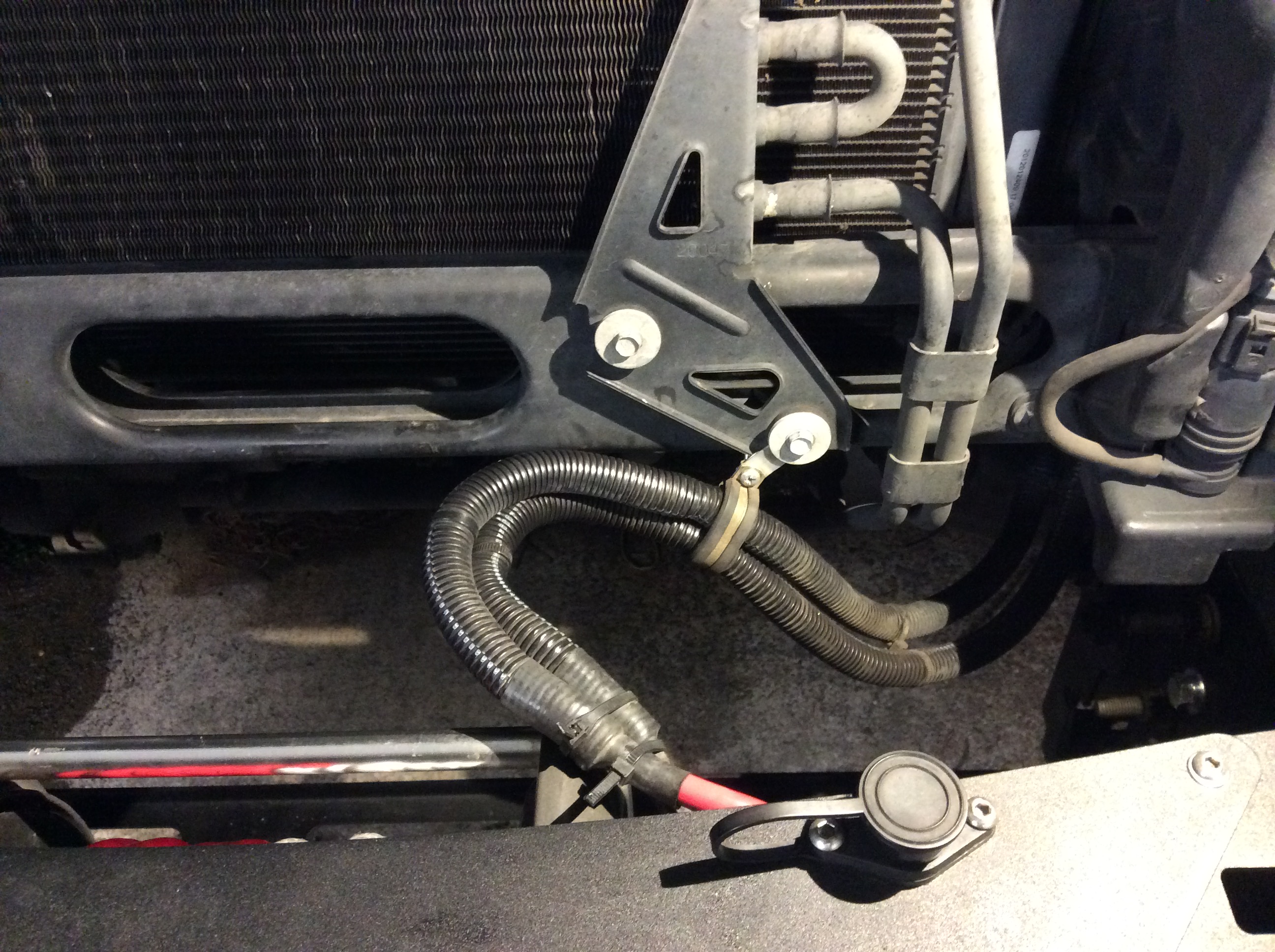 Instead of cutting, I was able to clean up the routing for the power and ground cable by re-using the factory clamps. I used the same location on the existing condenser bracket. Securing the cables is probably good. Otherwise they could hang down (around 10in below the radiator/condenser) and flop around, or worse, get caught on something.