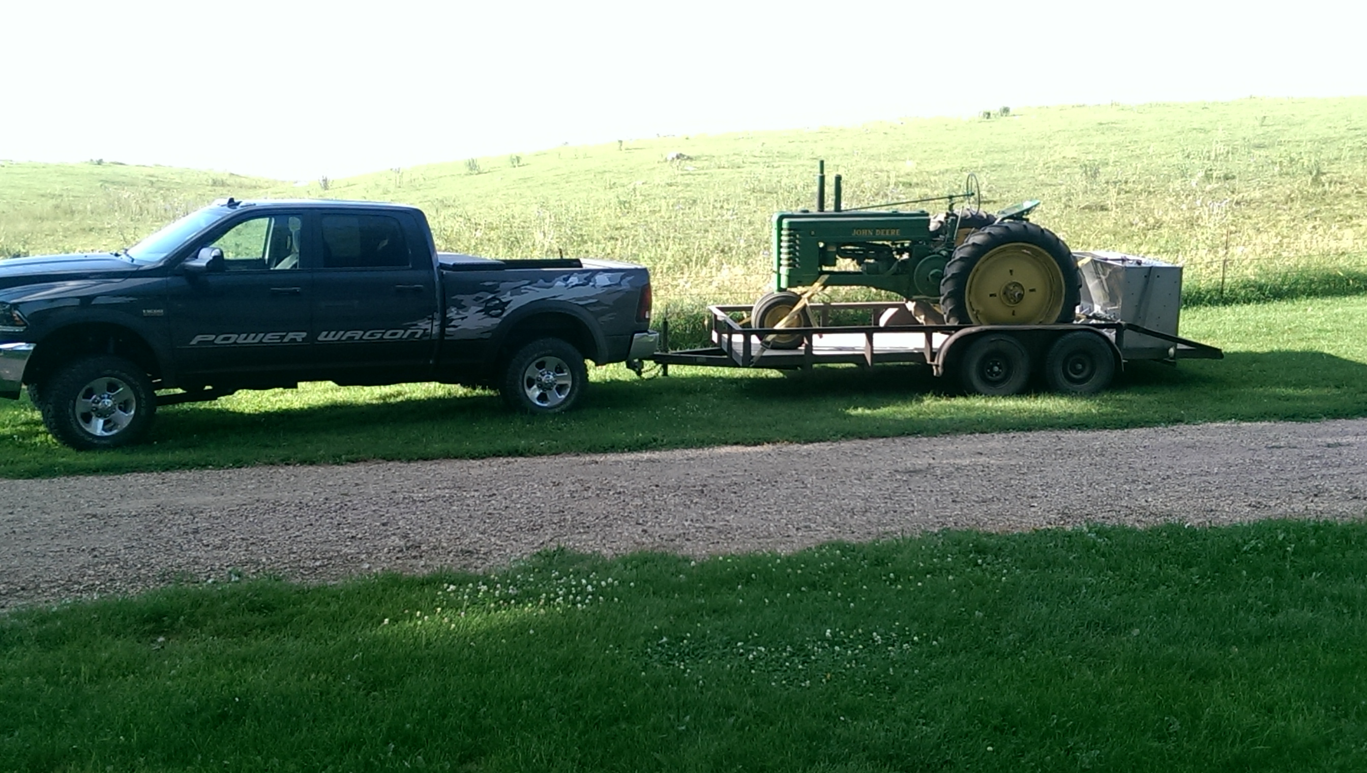 I inherited a 46 John Deere b from my grandpa so we made the trip to south Dakota. Also had a pig feeder on the trailer for my dad, family of four "young kids" and luggage. 1000 mile trip one way averaged around 8 to 10 if I was lucky. Truck pulled better than any other gas motor I've had deff missed the power stroke.  I'll try to get a pic