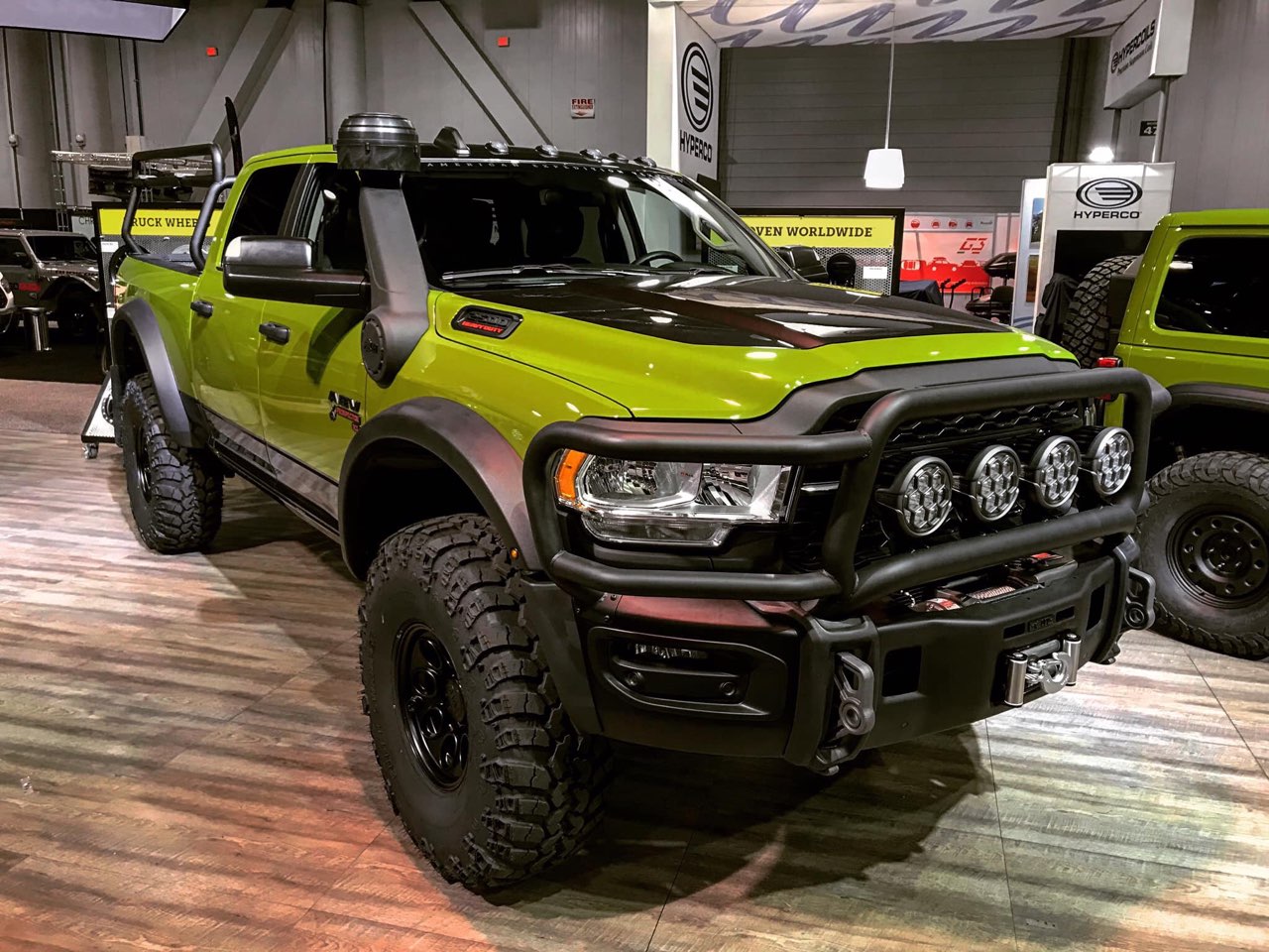 2016 Granite Crystal Metallic Power Wagon Laramie, graphics delete, debadged, Thuren front and rear coils, Thuren rear swaybar links, Thuren front and rear trackbars, Traxada rear 1 inch spacers, King 3.0 (Stage 4) front and 2.5 (Stage 3) rear shocks, Boogie front bump stops, Cooper STT Pro 37x13.50R17 on XD Machette 17x9 +18 wheels, Centramatics, 5.13 gears, DOR steering brace, Thuren truss, Thuren King Steering Damper, Synergy Steering Kit, Thuren PW front bumper, Thuren rear bumper, White Knuckle rock sliders, Dethloff skid plate, Dethloff rear sway bar spacers, Purple Cranium Half Spider front and rear diff guards, Airlift 5000 Ultimate airbags with Daystar cradles, Bakflip Revolver X2 tonneau, Factor55 Ultrahook with 100ft 7/16 A.R.E. Spidersilk synthetic winch line, Zroadz Grill with slim 20 inch light bar, DDM Tuning LEDs/HIDs, Rigid Side Shooter ditch lights, KC rock lights, Rigid fog lights, Baja Designs rear lights, Magnaflow 19200 modified with upgraded resonator and after axle dump, tinted front windows 35%.