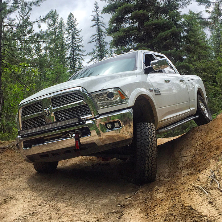 2016 Granite Crystal Metallic Power Wagon Laramie, graphics delete, debadged, Thuren front and rear coils, Thuren rear swaybar links, Thuren front and rear trackbars, Traxada rear 1 inch spacers, King 3.0 (Stage 4) front and 2.5 (Stage 3) rear shocks, Boogie front bump stops, Cooper STT Pro 37x13.50R17 on XD Machette 17x9 +18 wheels, Centramatics, 5.13 gears, DOR steering brace, Thuren truss, Thuren King Steering Damper, Synergy Steering Kit, Thuren PW front bumper, Thuren rear bumper, White Knuckle rock sliders, Dethloff skid plate, Dethloff rear sway bar spacers, Purple Cranium Half Spider front and rear diff guards, Airlift 5000 Ultimate airbags with Daystar cradles, Bakflip Revolver X2 tonneau, Factor55 Ultrahook with 100ft 7/16 A.R.E. Spidersilk synthetic winch line, Zroadz Grill with slim 20 inch light bar, DDM Tuning LEDs/HIDs, Rigid Side Shooter ditch lights, KC rock lights, Rigid fog lights, Baja Designs rear lights, Magnaflow 19200 modified with upgraded resonator and after axle dump, tinted front windows 35%.