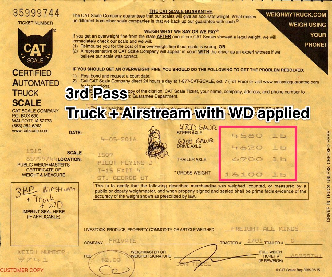 The third pass is with WD applied. And should show that I am distributing the weight evenly. I want the front axle weight to be close to what it was when first weighted just the truck. You can see here how the weights shift. And then you can adjust your WD from there.