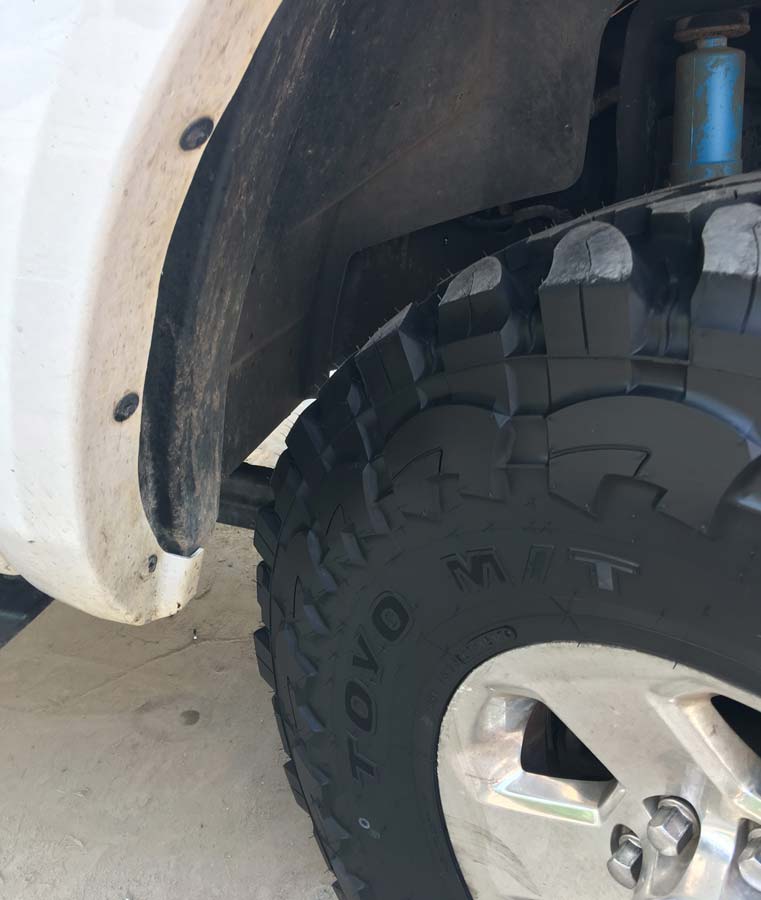 You're going to rub the bottom of the fender flair and the inner fender tunnel over the pinch weld. There is more clearance turned full lock then there is turning partial lock. RA trucks have more clearance at the RA than older trucks with 5 link, the rubbing is at the inner fender, flair, pinch weld, and sway bar (stock wheels only). A Thuren swaybar will give you more clearance at the swaybar.MikeKey wrote:I have no rubbing on fenders lock to lock, haven't done a full stuff test yet. I was going to do that later. I have factory wheels and high clearance bumper so my fenders up front were already cut. I think at full lock the front might rub the sway bar a tad. Have to do some more testing.NickTF wrote:You will probably have less rubbing then I do on the outside rear of the fender; however, I don't think you'll be able to turn lock to lock.