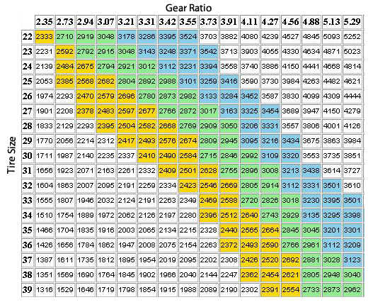 So those random thoughts lead to my question/thought. I know what 35's and 4.56 gears are like, but what would the gearing ratio be with 37" or 40" tires? I know that there's a spreadsheet calculator that I think Mogan put together before he bought his half ton Ram and disappeared, but I'm gear challenges so I thought I'd try to get everyone else's thoughts. Is 37" tires similar to 4.10's while 40's be similar to 3.73's?