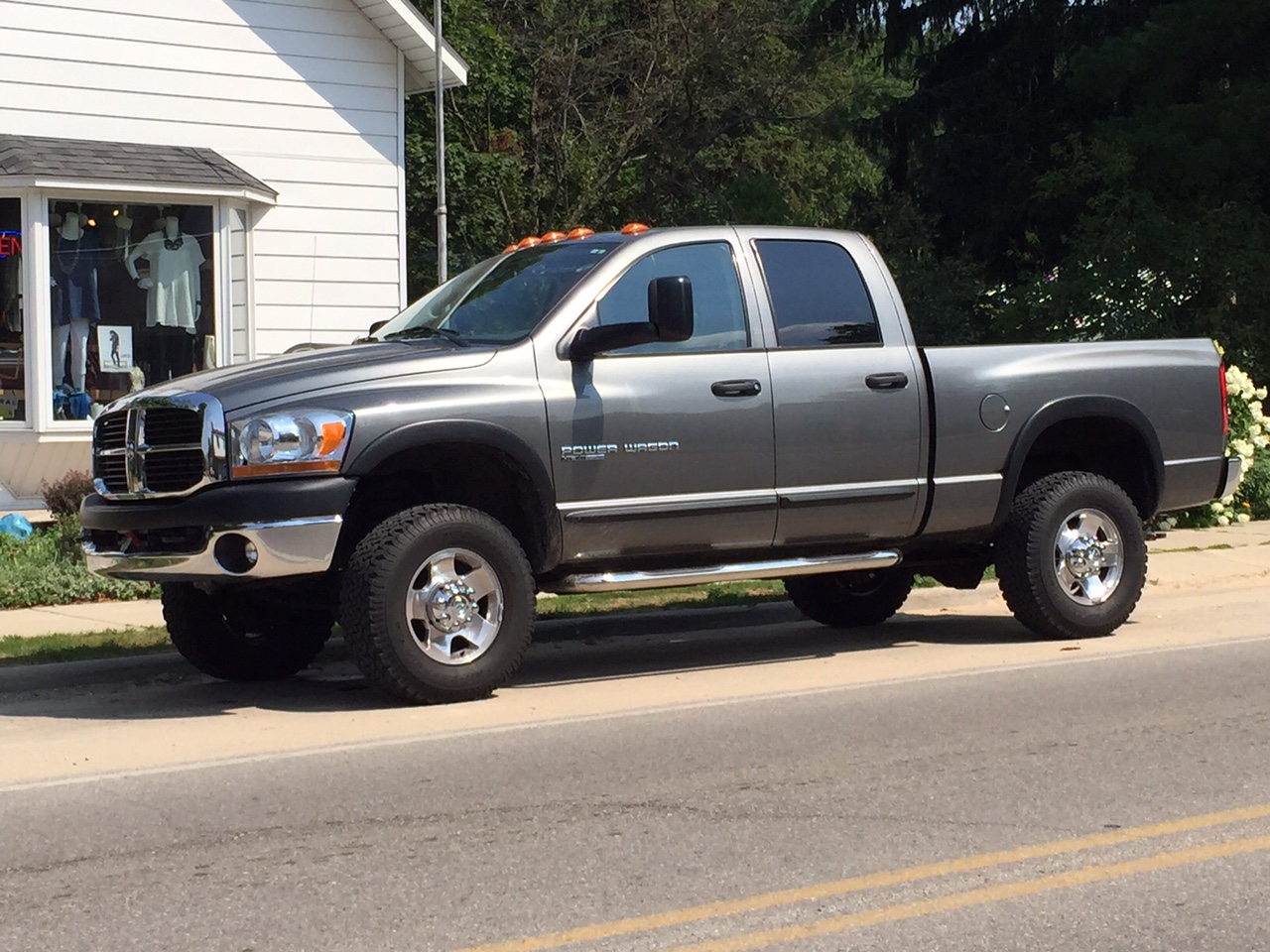 2005 Black Pow Wagon mods: DT Profab Steering Brace, Gibson superflow catback single exhaust system, Locker Bypass, Moog ball joints (see how long they last), New OEM track bar bushings, T-steering upgrade w/ Bilstein 5100 steering damper, Power everything, Heated leather seats, (keeps the better half happy), Rear window defrost, Bilstein 5100 shocks, 35x12.5x17 Toyo AT2 Extremes, Customized H2 alloy wheels, Original rock rails with family friendly steps welded on, Tri fold tonneau, Hi-lift extreme jack, Tool box along with all the essential PW gear. New winch cable, Winch TPS bypass, Cardan joint grease zerk discovery. New front grille assembly. Magnesium Chloride under coating.