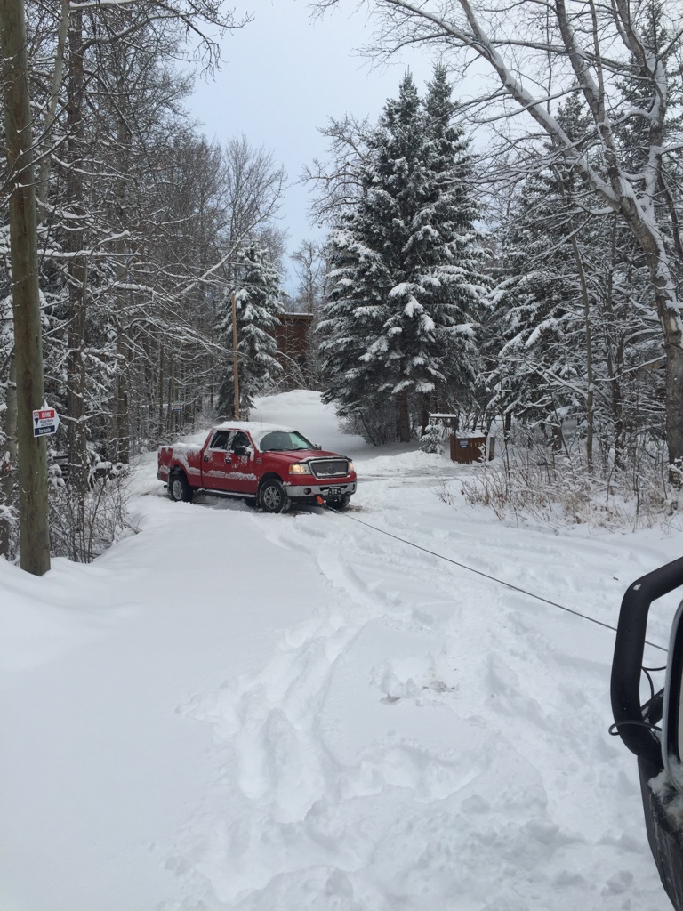 We got about 6-8" of snow last night, which was preceded by rain all day yesterday. My turnover coordinator called me, stuck in her driveway, unable to move. I got to drive 40 km out to pull her Ford outta the lane way, first time for the winch!! Whoo HOO!!