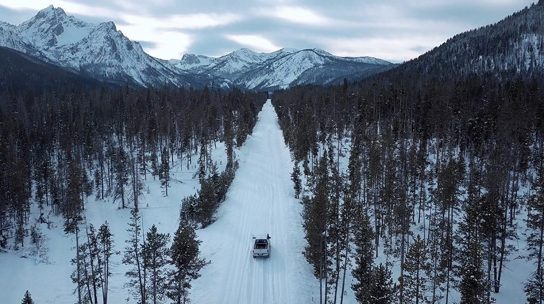 except the road's straight, and there's no snowmobile in the bed of the truck.