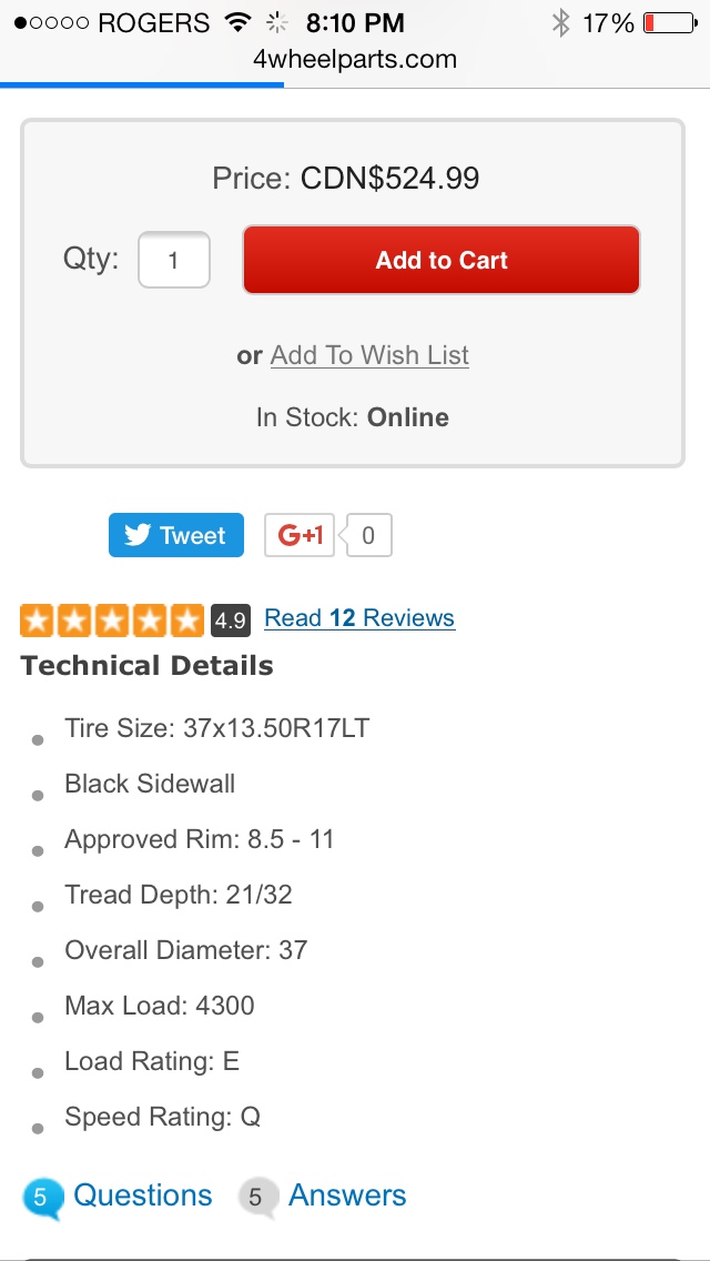 Great tire, got them used from my mechanic for free, they had 60% tread or better left on them. Great tire I ran them for a winter and spring before I blew a side wall. Would get them again if they made a 10ply 37" but, that's asking a little much I think.