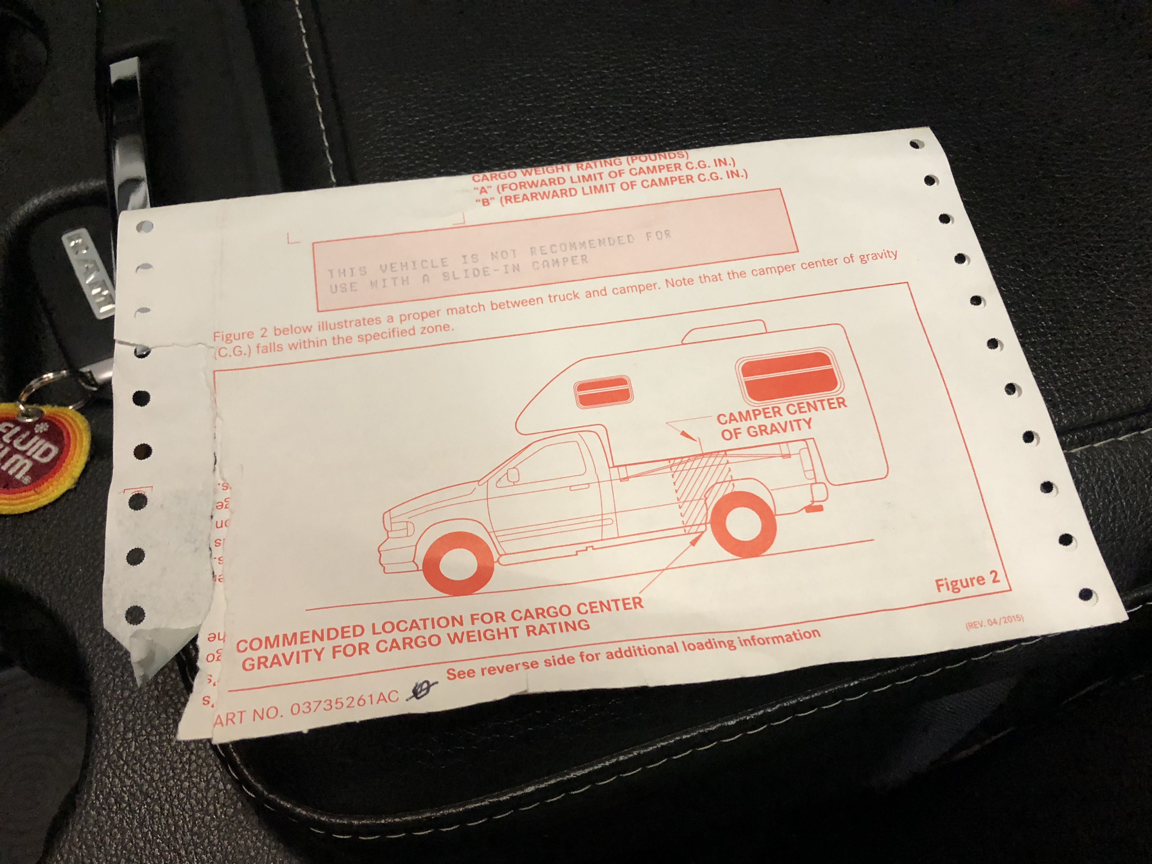 Interesting, I don't recall seeing that paper. I know your traditional slide-in usually has the overhang which leads to more weight to the rear and outboard of the bed and changes the COG of the camper itself. The FWC lacks that area and it's retained within the bed entirely. Being that it is a pop-top it has very little weight above the roof line of the cab as well. I am more concerned with the rear squatting due to the load than I am with how it performs in corners and at speed. Those things matter as well, but I am simply curious as to whether or not 1000lbs will make the truck squat.