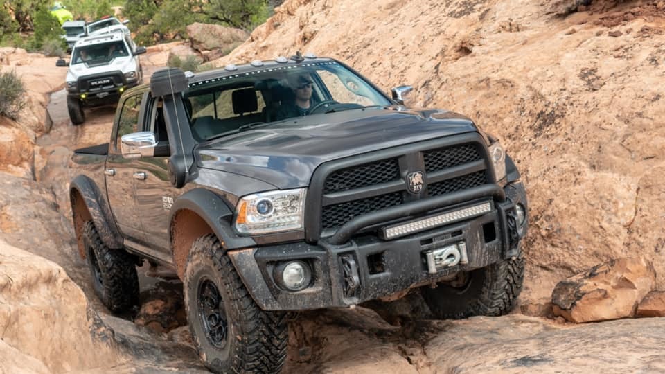 2016 Granite Crystal Metallic Power Wagon Laramie, graphics delete, debadged, Thuren front and rear coils, Thuren rear swaybar links, Thuren front and rear trackbars, Traxada rear 1 inch spacers, King 3.0 (Stage 4) front and 2.5 (Stage 3) rear shocks, Boogie front bump stops, Cooper STT Pro 37x13.50R17 on XD Machette 17x9 +18 wheels, Centramatics, 5.13 gears, DOR steering brace, Thuren truss, Thuren King Steering Damper, Synergy Steering Kit, Thuren PW front bumper, Thuren rear bumper, White Knuckle rock sliders, Dethloff skid plate, Dethloff rear sway bar spacers, Purple Cranium Half Spider front and rear diff guards, Airlift 5000 Ultimate airbags with Daystar cradles, Bakflip Revolver X2 tonneau, Factor55 Ultrahook with 100ft 7/16 A.R.E. Spidersilk synthetic winch line, Zroadz Grill with slim 20 inch light bar, DDM Tuning LEDs/HIDs, Rigid Side Shooter ditch lights, KC rock lights, Rigid fog lights, Baja Designs rear lights, Magnaflow 19200 modified with upgraded resonator and after axle dump, tinted front windows 35%.