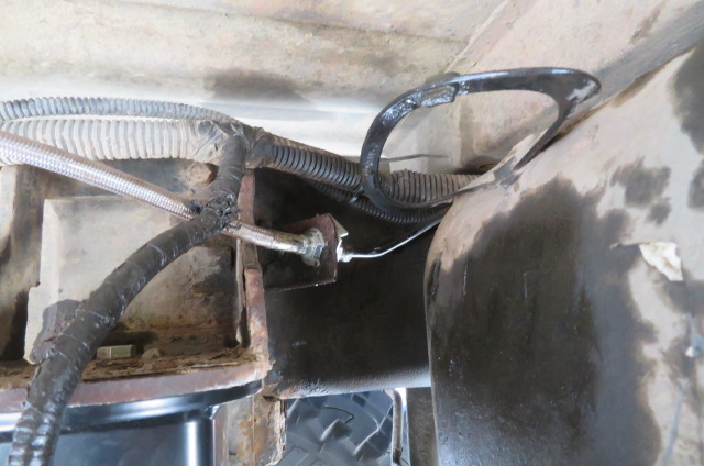 3rd pic. Replaced the rear brake line with a 4" longer stainless brake hose. And added spacers to my air bags to keep them from pulling apart. The rear suspension has lots"of suspension travel too. Enough that my rear drive shaft hits the rear cross member.