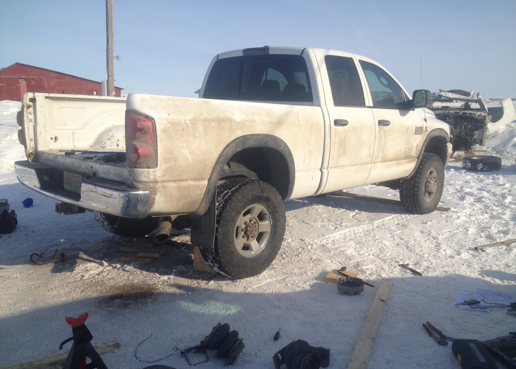 Just finished taking her for a spin. The power is retarded now. Gonna have to turn down the tuner. Doing 110 on the gravel its easy to spin the tires to 130. I mean it likes to spin the tires. Big change in cruising rpm. 105 used to be 1500 rpm. Now its 1600rpm for 95kph. Was worried heard a huge clunk in the front end. All worried. Ended up being the hood was popped. Doh!! Have some tie rods to fix up yet the. Should be good to go. The back is now taller than the 2500 diesel with carli add packs. And way way smoother. Only thing left now is front driveshaft hookup and wire up the lockers. I'd say this has been a successful endeavour.