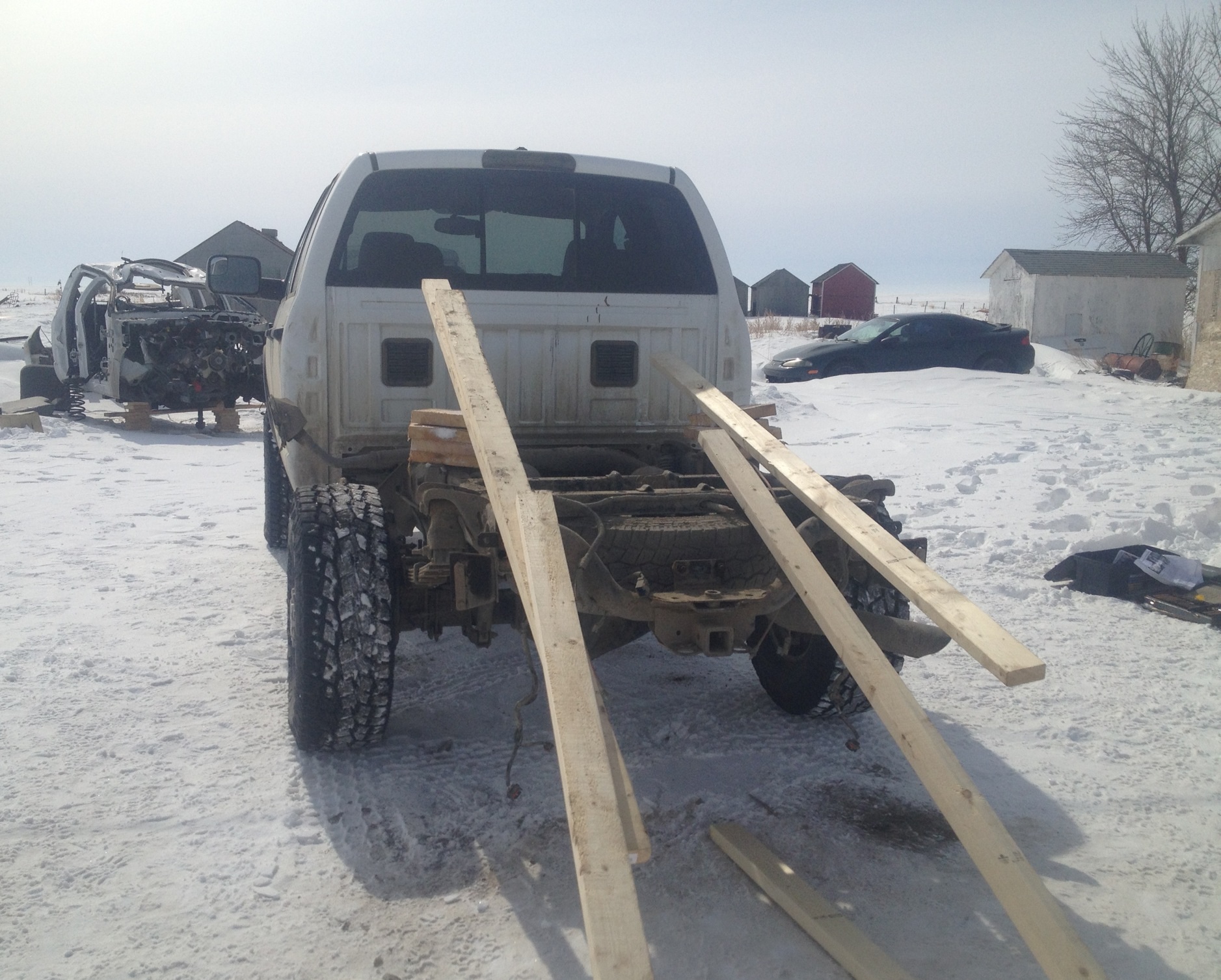 Just finished taking her for a spin. The power is retarded now. Gonna have to turn down the tuner. Doing 110 on the gravel its easy to spin the tires to 130. I mean it likes to spin the tires. Big change in cruising rpm. 105 used to be 1500 rpm. Now its 1600rpm for 95kph. Was worried heard a huge clunk in the front end. All worried. Ended up being the hood was popped. Doh!! Have some tie rods to fix up yet the. Should be good to go. The back is now taller than the 2500 diesel with carli add packs. And way way smoother. Only thing left now is front driveshaft hookup and wire up the lockers. I'd say this has been a successful endeavour.