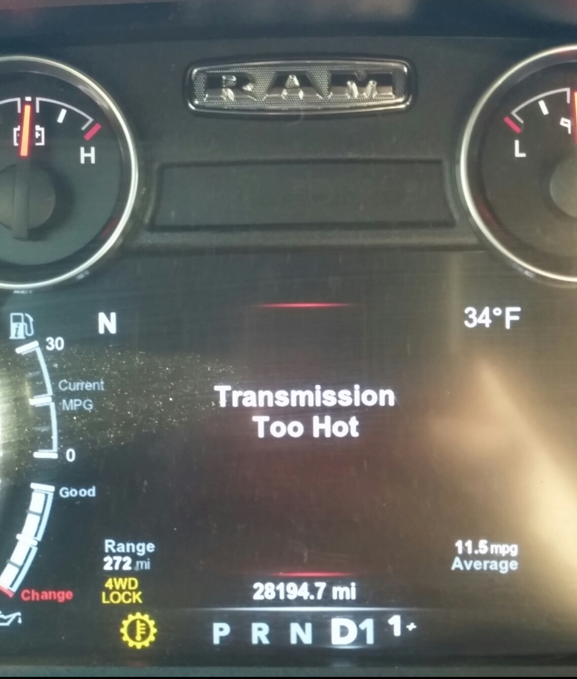 Fast forward 2 days to Thursday. They leave me a voicemail telling me that Chrysler's official decision and solution is...drum roll please....to replace the instrument cluster. Not the transmission, not the PCM, the guages themselves. Idk, to me that's like getting an error message on your computer and replacing the monitor to fix the problem. Of course it will be next week before the new cluster even gets in, I'm not authorised a loaner, and I don't feel comfortable driving the truck. So in 7-10 days when I finally get it back, the first thing I'm doing is heading back to my hill and getting the transmission temp above my highest recorded warning to make sure that it's "fixed". Honestly I don't even know who to be upset. I don't know what my options are. I don't think this issue qualifies for a Lemon case, I didn't buy from a dealer so getting trade or buy back seems pretty impossible since they already treat me like the black sheep when they see the carmax sticker on it. The only good news is that compared to my 1500, I am saving tons of money on gas.