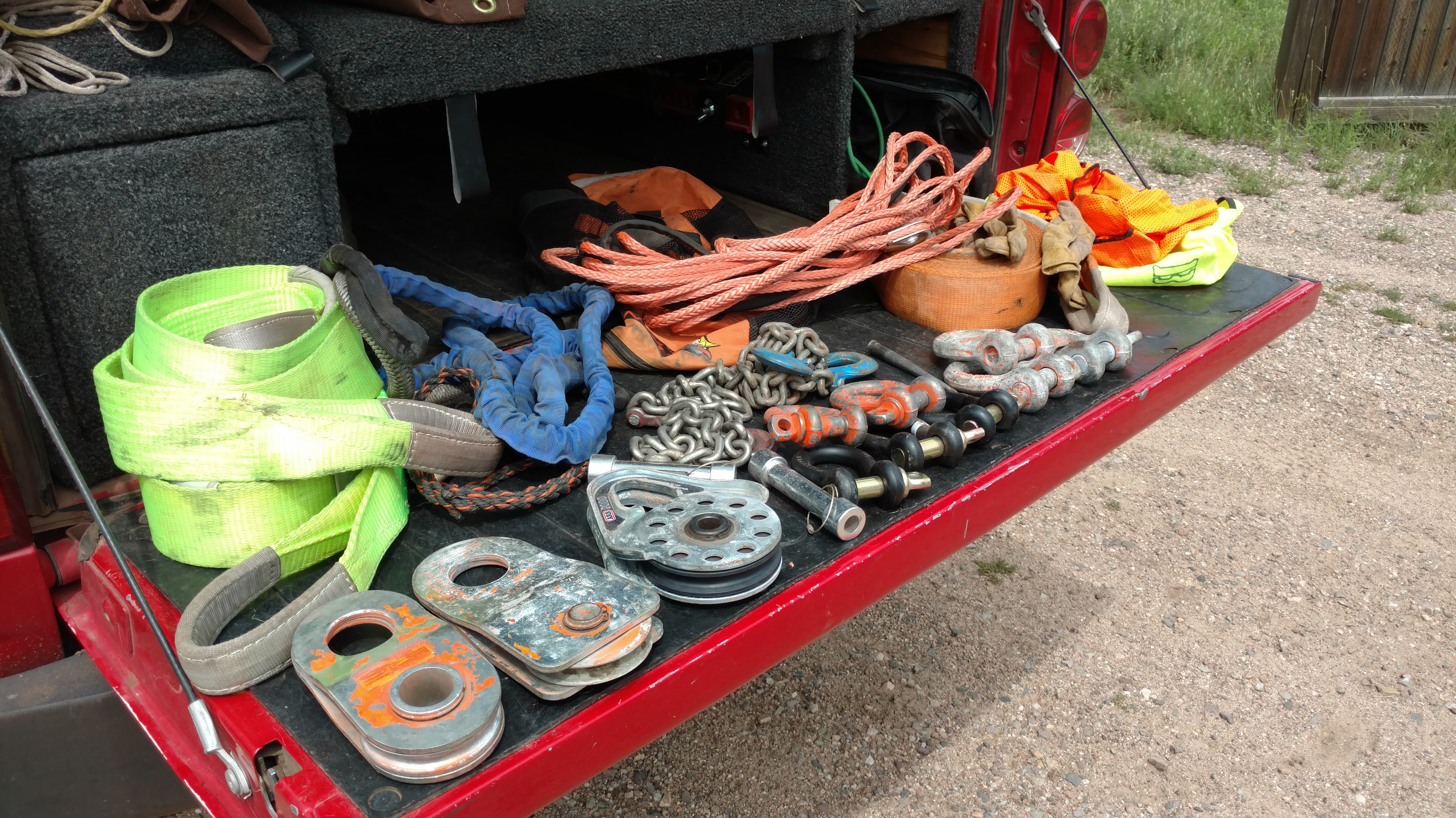 This is my kit. All three pulley's are 20K rated, the shackles are (5) 3/4" and (3) 7/8", all rated at 6.5T. Don't over think it - these have done multiple double line pulls, dozens of single line pulls, and many redirected pulls. The snatch blocks are: Smitty Built 20K, ARB 9000 20K, Warn 88899 20K. If I'm going to load the system really heavy, the ARB is my #1 choice. Two ARB tree savers, one WinchLine.com 50' extension, one 10' rigging strap, two rope bones, one ARB 3" x 30 tow strap, and a couple safety vests. If we know we're heading into really bad conditions, I take the gear out of the JKUR which doubles what's shown here.