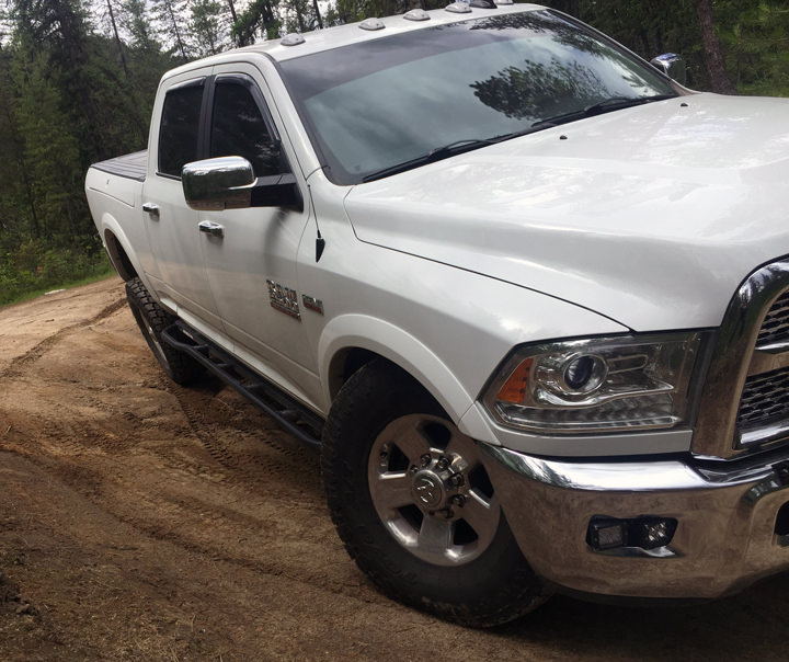 2016 Granite Crystal Metallic Power Wagon Laramie, graphics delete, debadged, Thuren front and rear coils, Thuren rear swaybar links, Thuren front and rear trackbars, Traxada rear 1 inch spacers, King 3.0 (Stage 4) front and 2.5 (Stage 3) rear shocks, Boogie front bump stops, Cooper STT Pro 37x13.50R17 on XD Machette 17x9 +18 wheels, Centramatics, 5.13 gears, DOR steering brace, Thuren truss, Thuren King Steering Damper, Synergy Steering Kit, Thuren PW front bumper, Thuren rear bumper, White Knuckle rock sliders, Dethloff skid plate, Dethloff rear sway bar spacers, Purple Cranium Half Spider front and rear diff guards, Airlift 5000 Ultimate airbags with Daystar cradles, Bakflip Revolver X2 tonneau, Factor55 Ultrahook with 100ft 7/16 A.R.E. Spidersilk synthetic winch line, Zroadz Grill with slim 20 inch light bar, DDM Tuning LEDs/HIDs, Rigid Side Shooter ditch lights, KC rock lights, Rigid fog lights, Baja Designs rear lights, Magnaflow 19200 modified with upgraded resonator and after axle dump, tinted front windows 35%.