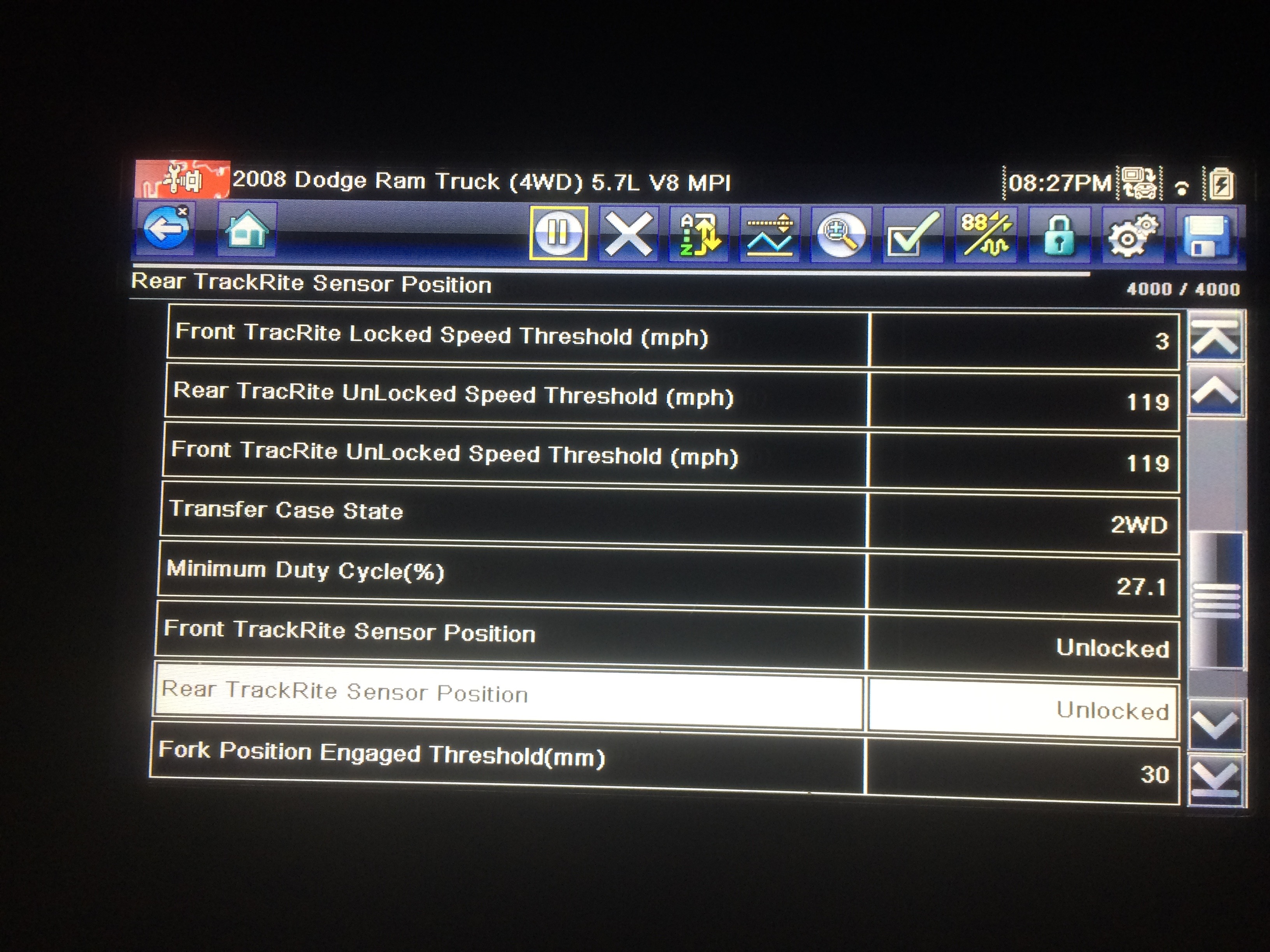 I was able to read data while I was driving and as I would go around corners and hit bumps the data would change from "unlocked" to "short to ground" and back again. When I got back to my house there was a code stored and the light was still flashing. I left the engine running and put my scanner under the truck so I could see it. As I wiggled the harness and connector I could change the data so I knew it was a bad connection somewhere. When I unplugged the connector the data continued to read "short to ground". The factory service manual told me to put a jumper wire between pin #2 & 3, when I did that, then it said "short to battery" and wouldn't change as I wiggled the harness.